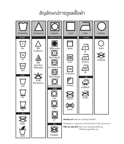 สัญลักษณ์ในตารางด้านล่าง เป็นเพียงสัญลักษณ์พื้นฐานเท่านั้น คือการซัก การฟอกขาว การปั่น/อบแห้ง การตาก การรีด และการซักแห้ง