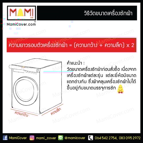 - ลูกค้าจำเป็นต้องวัดขนาดเครื่องซักผ้าก่อนสั่งซื้อ เพื่อให้ผ้าคลุมมีขนาดพอดีกับเครื่องซักผ้า โดยดูความยาวรอบตัวเครื่องซักผ้าเป็นหลัก เนื่องจากเครื่องซักผ้าแต่ละรุ่น แต่ละยี่ห้อ มีขนาดแตกต่างกันไป ซึ่งผ้าคลุมเครื่องซักผ้าไม่ได้ขึ้นอยู่กับขนาดบรรจุการซัก แนะนำให้ดูขนาดจากคู่มือของเครื่องซักผ้า