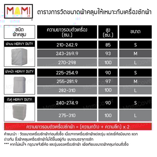 - ลูกค้าจำเป็นต้องวัดขนาดเครื่องซักผ้าก่อนสั่งซื้อ เพื่อให้ผ้าคลุมมีขนาดพอดีกับเครื่องซักผ้า โดยดูความยาวรอบตัวเครื่องซักผ้าเป็นหลัก เนื่องจากเครื่องซักผ้าแต่ละรุ่น แต่ละยี่ห้อ มีขนาดแตกต่างกันไป ซึ่งผ้าคลุมเครื่องซักผ้าไม่ได้ขึ้นอยู่กับขนาดบรรจุการซัก แนะนำให้ดูขนาดจากคู่มือของเครื่องซักผ้า